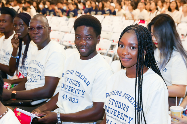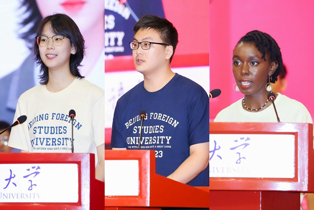 本科新生代表阿拉伯学院石莉莉以“北外的门”为主题表达了自己对北外精神的理解,并号召同学们打开热爱的大门,打开世界的大门,打开回家的大门,永远牢记走出的大门。研究生新生代表亚洲学院张子言从自己的研究方向“印度社会文化研究”与所依托的梵语、巴利语出发,思考当代北外人的目标与使命,号召同学们将小我与人类命运共同体的伟大事业结合,发挥专业优势,播种新希望、放飞新梦想、踏上新征程。留学生代表、中国语言文学学院硕士生、来自肯尼亚的夏雨柔(NGUGI SHARON WANJIKU)在发言中回忆了学习中文的经历,希望通过在北外的学习,将中华文化带到家乡,弘扬北外校训精神,为搭建中非沟通的友谊桥梁贡献力量。