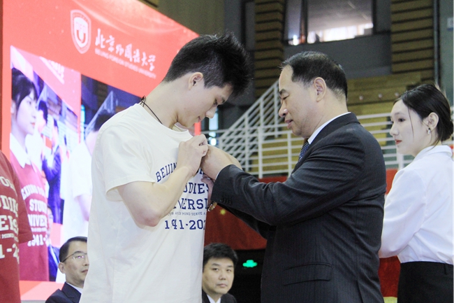 王定华为新生代表们佩戴校徽,并颁发校园卡。在场的全体新生一同佩戴校徽,正式成为“北外人”,肩负起“人民需要我们到哪里,我们就到哪里”的北外使命。