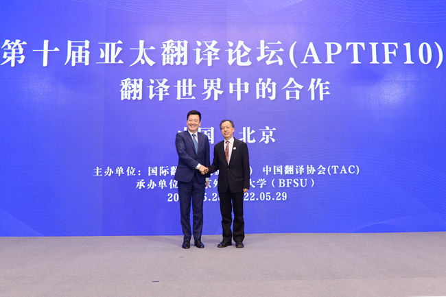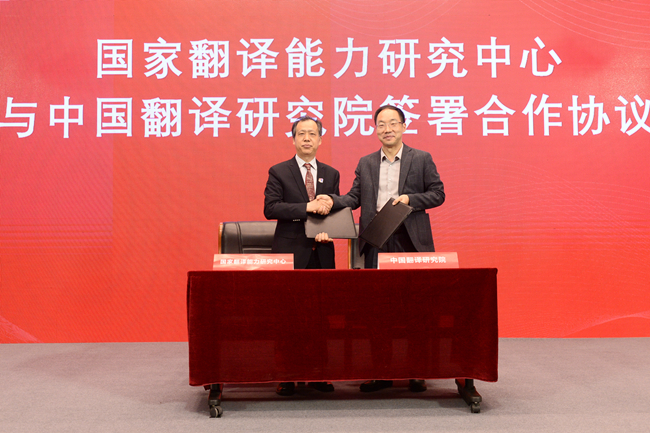 孙有中与中国外文局当代中国与世界研究院院长于运全在现场嘉宾见证下共同签署了《威客电竞(vk·game)·电子竞技赛事官网,国家翻译能力研究中心与中国翻译研究院合作协议》,与中国外文局国际部主任姜永刚共同发布了“第十届亚太翻译论坛”官方网站及一号通知,标志着“第十届亚太翻译论坛”筹备工作全面启动。