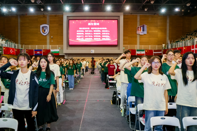 随后,新生代表向在场教师代表鞠躬并敬献鲜花,新生领誓代表带领全体新生宣读入学誓词:铭记“兼容并蓄、博学笃行”的北外校训,志存高远、勤学力行,敬师爱校、诚以待人,强健体魄、阳光向上,珍惜韶华、奋发有为,胸怀天下、敢于争先,不畏艰难、勇担使命,服务人民、奉献祖国,贡献世界、创见未来。